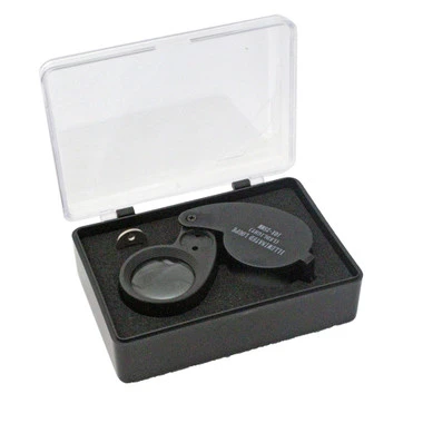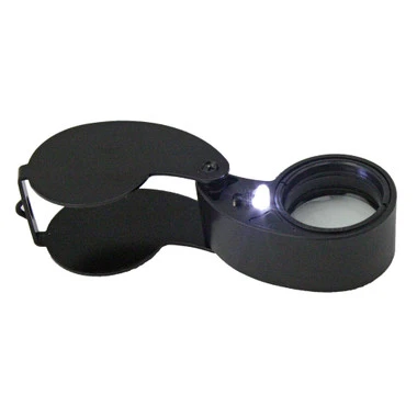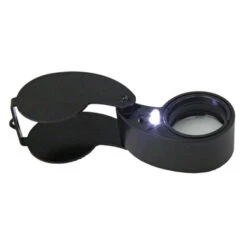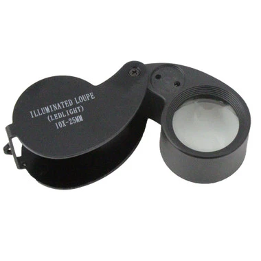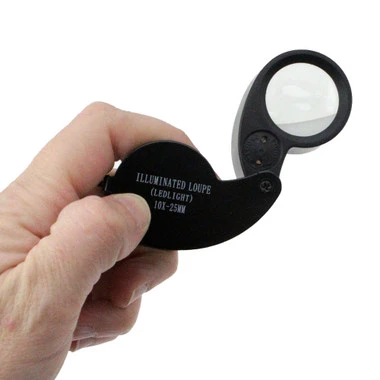 This folding style loupe has a large, 25mm lens with 10X magnification. Two L.E.D.s provide super bright illumination. Includes three AG7 cells and a handy storage case.