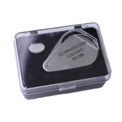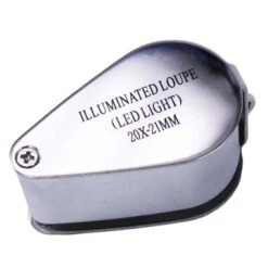 This folding style loupe has a large, 21mm lens with 20X magnification. Two L.E.D.s provide super bright illumination. Includes three LR927/399 cells and a handy storage case.
