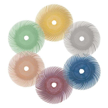 3M® Radial Bristle Discs are embedded with a long-lasting abrasive material which eliminates the need for messy compounds. Flexible and cool-running bristles are great for hard-to-reach areas or flat surfaces. Clean and remove dirt, rust and oxidation without damaging the underlying surface. These discs do not generate the same amount of heat as rubber wheels do, making them great for delicate items. Use on platinum, gold, silver, pewter, aluminum, steel and stainless steel. These 3″ discs have 3/8″ arbor hole and are available in six different grits. Sold in packs of 3.