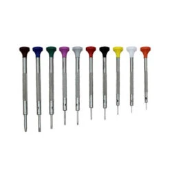 This popular selection features color coded hex shaped heads and replaceable screwdriver blades. The blades can be changed by using the tightening nut at the end of the screwdriver (called a “set screw”) making it very quick to replace screwdriver blades. Includes the most common sizes for watch repair: 0.50, 0.60, 0.80, 1.00, 1.20mm, 1.40, 1.60, 2.00, 2.50 and 3.00mm; with two spare blades for each size. Spare blades are available and store conveniently in the color coded plastic tubes.