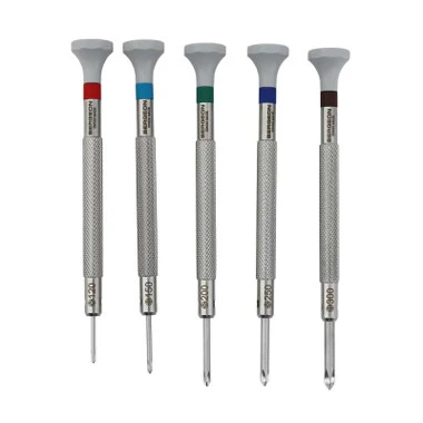 Bergeon 30081-C Phillips screwdrivers offers five different sizes in 1.20, 1.50, 2.00, 2.50 and 3.00mm. Each screwdriver handle is knurled and has a synthetic self-lubricating POM material head for a comfortable grip. Blades are made of hardened stainless steel 54/56 HRC. Made in Switzerland