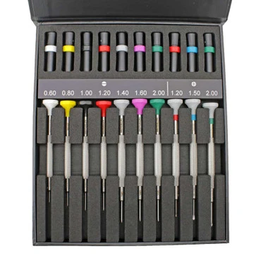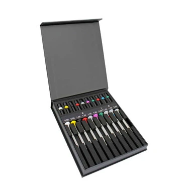 This new selection features color coded hex shaped heads and replaceable screwdriver blades. The blades can be changed by using the tightening nut at the end of the screwdriver (called a “set screw”) making it very quick to replace screwdriver blades. This set is supplied in a deluxe wood box. Includes the most common flat head sizes for watch repair: 0.60, 0.80, 1.00, 1.20, 1.40, 1.60, and 2.00mm; and three Phillips head sizes: 1.20, 1.50, and 2.00mm with spare blades for each size. Spare blades are available and store conveniently in the size coded plastic tubes.