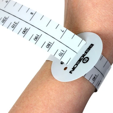 Flexible measuring band for wrist (watch band size) that is accurate and easy to use. Made of tough tear resistant synthetic material. It fits easily to the wrist. Graduated in mm and inches. Large numbers that are graduated in millimeters and inches gives you an accurate comfortable choice for your watch bands. A great give-away promotion for bracelet and watch sales.