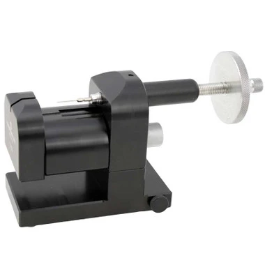 New from Bergeon, this pin driving stand allows you to drive bracelet pins in and out without the use of hammers in a very easy way. The band support table adjusts height to fit a variety of sizes of band. Easy to use operation, just place the band in the support and line the link pin with the pusher pin. Use the outside screw to apply pressure and push the pin out of the band. This design reduces the chance of damage being done by taking out the margin of human error and hand held pin pusher and hammer have. Supplied with 5 pins, 1 each of 0.80 and 1.00 in long and short lengths and a flat end pin.