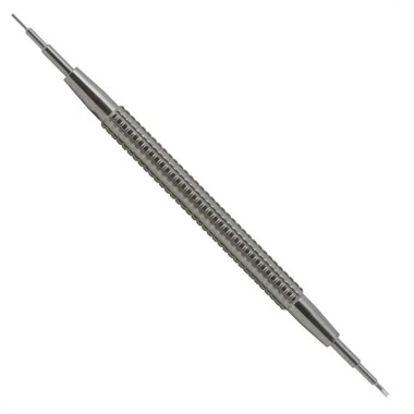 Bergeon introduced this improved spring bar tool in 2017. It features all stainless steel construction with a textured, comfortable handle. Forked end is 1.20mm wide and point end diameter is 0.80mm. Tips are hardened steel and thread into tool; spare tips are available. It is the perfect tool for removing spring bars from metal and leather watch bands. The forked end works great for opening spring bars and the pointed end is just right for compressing shouldered spring bars from the lug holes.Â