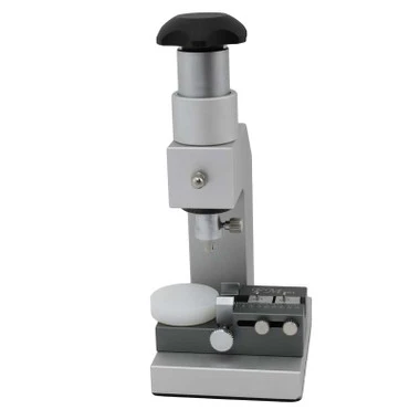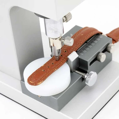 Our custom hole punch tool cuts a clean, accurate hole in leather, pvc, silicone and other soft materials. Rugged steel fixture has a large turning knob to smoothly lower the cutting punch. Features a band holding mechanism with removable pins to hold band in place and a ruler to measure the distance from band holes for accurate hole placement. A 1-1/8″ delrin base rotates and supports band for cutting. Its larger base (5″ x 4″) provides stability and has a foam pad to keep in place. Supplied with 8 hardened steel cutting punches in four shapes: rectangle (4×2, 6×4), oval (3.5×2.5), rounded rectangle (4.6×2.6, 5.5×2.8) and round (2.0, 2.6, 3.0mm); and 16 band holding pins in 4 shapes (2) each size: round (1.3, 1.8, 2.3mm), rectangle (3.3×1.85, 5.8×3.8), oval (2.8×1.8), and rounded rectangle (3.8×1.9, 4.8×1.8). Includes tightening wrench and extra turning knob for punches.Â