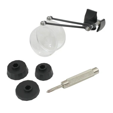 Changeable cams are included to fit eyeglass frames from 1/16″ to 1/4″ temple width. The eyeglass clamp easily converts from right to left temple mounting.