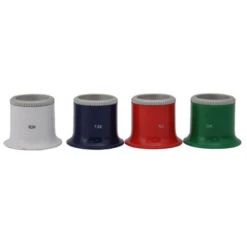 - Four color-coded plastic loupes;Â 10x (white), 7.5x (blue), 5x (red), and 3x (green)