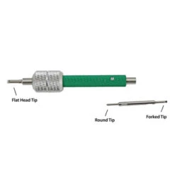 This compact mulit-purpose tools was designed for adjusting the Rolex® Submariner bracelet. It has a barrel grip for better handling and increased torque when removing and inserting screws. OEM blade and tip sized to match the Rolex® Tool 2100. Supplied with two reversible blades – the straight screwdriver tips are 1.7mm and 1.3mm, the other blade has a 1mm fork end and .90mm round tip. Flat head tip fits Rolex® bracelet screws while pointed tip is used for spring bar removal through the lug hole. Blades are replaceable.
