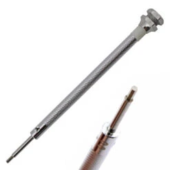 This professional grade tool removes spring bars without having to take the watch bracelet clasp off. Features a specially shaped stainless steel handle which aligns the tips and evenly compresses the spring bar for simple removal without slipping or scratching the case. Hardened steel tips are extra fine, just 1.0mm, ideal for brands with very little space between the case lugs and bracelet. Set includes the spring bar tool, a hex driver (1.4mm) to change tips, plus an extra pair of reversible tips. Overall size is 4.5″ x 1.75″.