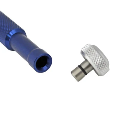 This sturdy, wide body screwdriver is supplied with a special tip for removing Tri Wing screws from Oris watches.Choose from 1.60mm or 2.50mm blade; tip is shaped with three wing tip – similar to a phillips head with only three sides. Aluminum body has an ergonomic design with knurled handle for a better grip. The cap comes off to store extra blades. Blades are held in place with a set screw.