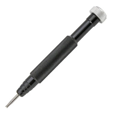 Heavy duty screwdriver for opening Richard Mille® watches. Special type of blade has 5 prongs for fitting RM case screws. Aluminum body has an ergonomic design with knurled handle for a better grip. The cap comes off to offer storage of spare blades inside the screwdriver body. Color of handle may vary from picture.