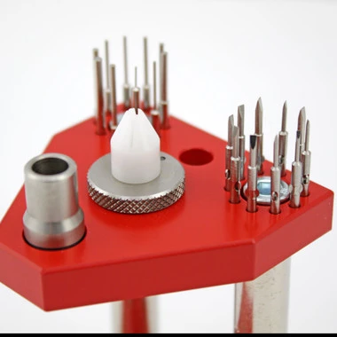 This watch band tool by Horotec was designed with two simple goals in mind: to simplify your work and last a lifetime. This kit allows you to easily remove and fit lug screws, bracelet screws, and friction pins while adjusting a watch band. This aluminum and steel frame punch holder allows you to quickly change the blades of your pin punch to do more jobs with the same tool. Attractive and functional, this multi-purpose press includes; band holder, pin holder with a set of 11 pins, screwdriver with a total of 12 blades and an interchangeable blade in a nylon case protector