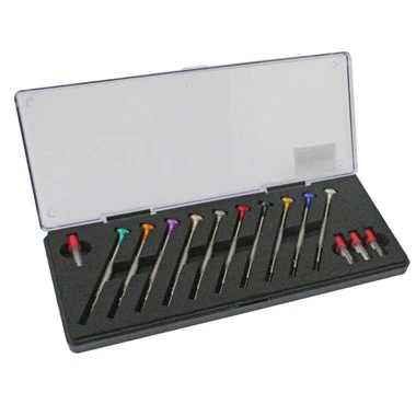 Horotec has developed this new series of screwdriver which feature a unique scoop-curve to form the ideal T-shaped blade. Top quality, with superior stainless steel handle, hex heads on ball bearing and stainless steel blades. A truly professional tool with an incredible feel and balance. Assortment of 10 screwdrivers in a form fit storage tray and includes a replacement blade for each size plus two set screws. Replacement blades and individual sizes screwdrivers are also available.