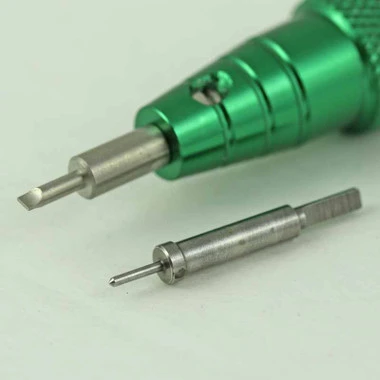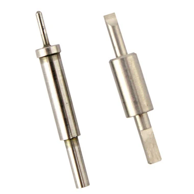 Replacement tips for the screwdriver that removes oyster and jubilee bracelet link screws on Rolex® watches. Two blades are included: 1.70mm flat head hollow ground tip and 0.90mm pointed pusher tip. Flat head tip fits Rolex® bracelet screws while pointed tip is used for spring bar removal through the lug hole. OEM blade and tip sized to match the Rolex® Tool 2100. Tips are held in place with a set screw