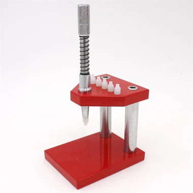 This sturdy fixture gives you better control when fitting watch hands. It is supplied with seven different nylon tips which fit conveniently on top of the tool. The tips have holes in them to fit over the posts when inserting the hands, the tip sizes include 0.50 mm, 0.70 mm, 0.90 mm, 1.20 mm, 1.50 mm, 1.60 mm and also includes a flat tip with no hole. Metal base measures 3-1/4″ x 2-1/2″ inches and provides a nice work surface. Spring-loaded with an all metal construction and an attractive red finish.