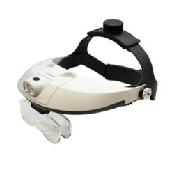 Welcome to the latest innovation in headband magnifiers! This models feature a 2-LED detachable light source and five lens plates which can be used individually or in combination. Single lens magnifications are: 1.0x, 1.5x, 2.0x, 2.5x and 3.5x. Dual plate magnifications are: 3.0x, 4.0x, 4.5x, 5.0x, 5.5x and 6.0x. A handy box stores and protects the plates. Bright, 2 LED light source can be removed for separate use. Large adjusting knobs make proper fitting easy. Powered by three AAA batteries (included).