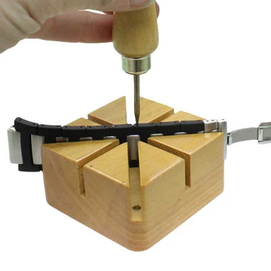 Sometimes, the old fashioned way is the best way to go. This affordably priced pin pusher is made of hardened stainless steel with a comfortable wooden hand grip. With its larger styled handle, this punch allows you to easily push stubborn watch band links from a metal watch band. Because its slightly flattened tip prevents the point from slipping, it is incredibly useful for band sizing or link pin replacement. Use with a small ball-peen hammer and a bracelet holder as an alternative to the Link Pin Remover Tool. This tool is ideal for watchmakers, students and goldsmiths, making watch and jewelry repair quick and easy.