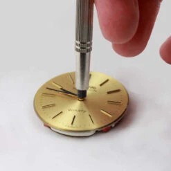 Quartz and mechanical watch hand presser watchmakers tool for replacing watch hands. Features steel construction with non scratching ends and a knurled grip. To help in putting the hands on with no slipping and even pressure so they do not bend the hands or the watch movement post. Double ended for various size watch hands and posts.