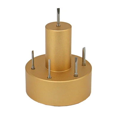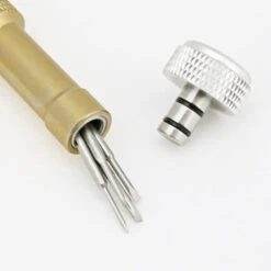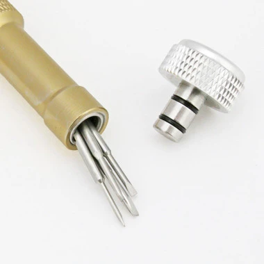 This new set combines a heavy-duty screwdriver with a convenient screw base which can be used on double-sided screws or separately. Supplied with six straight, steel blades sizes 1.0, 1.2, 1.4, 1.6 (2) and 1.8mm. Blades are held firmly in each tool with a side mount set-screw. Screwdriver features a knurled swivel head and handle for better control. The solid base holds blades and has a cushioned, non-slip base; screwdriver has five spare blades stored in the handle..